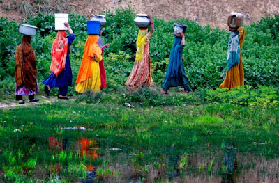 Pakistani women make their way towards their homes after collecting fresh water from a water point on the outskirts of Islamabad, Pakistan